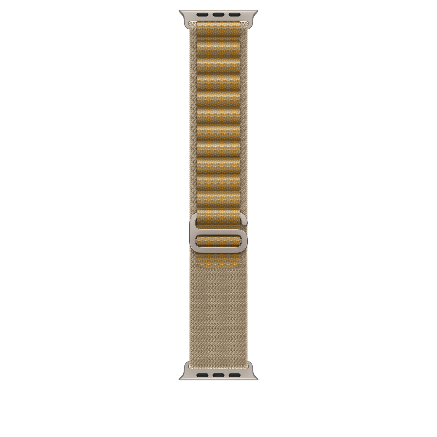 The rugged Alpine Loop is made from two textile layers woven together into one continuous piece without stitching. High-strength yarns reinforce the top loops, and the corrosion-resistant titanium G-hook slides easily into the loops for secure fit. This strap is carbon neutral. The Alpine Loop contains 43% recycled content by weight, 100% of manufacturing electricity is covered by clean energy, and 50% or more of all carbon-neutral Apple Watch products are shipped without aeroplanes.
