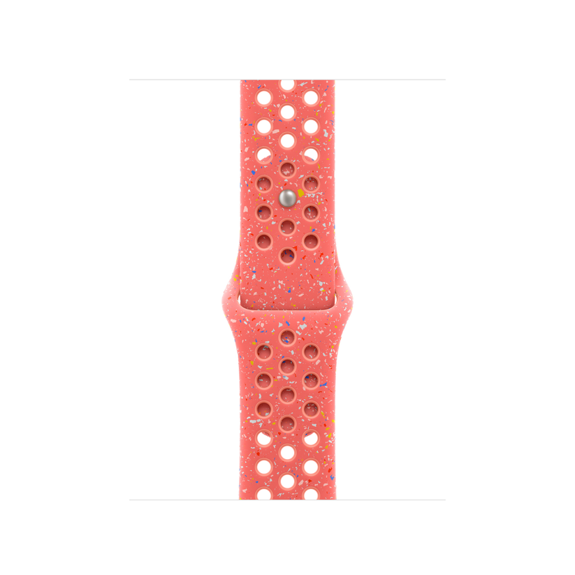 Made with compression-moulded perforations for breathability, the Nike Sport Band is durable and strong, yet surprisingly soft. It features colourful flakes that create a randomised pattern, making each strap completely unique. The smooth, dense material drapes elegantly across your wrist and feels comfortable next to your skin. A new aluminium pin-and-tuck closure gives the pin a fresh matt finish. This strap contains at least 32% recycled fluoroelastomer, with each flake containing at least 66% recycled fluoroelastomer.