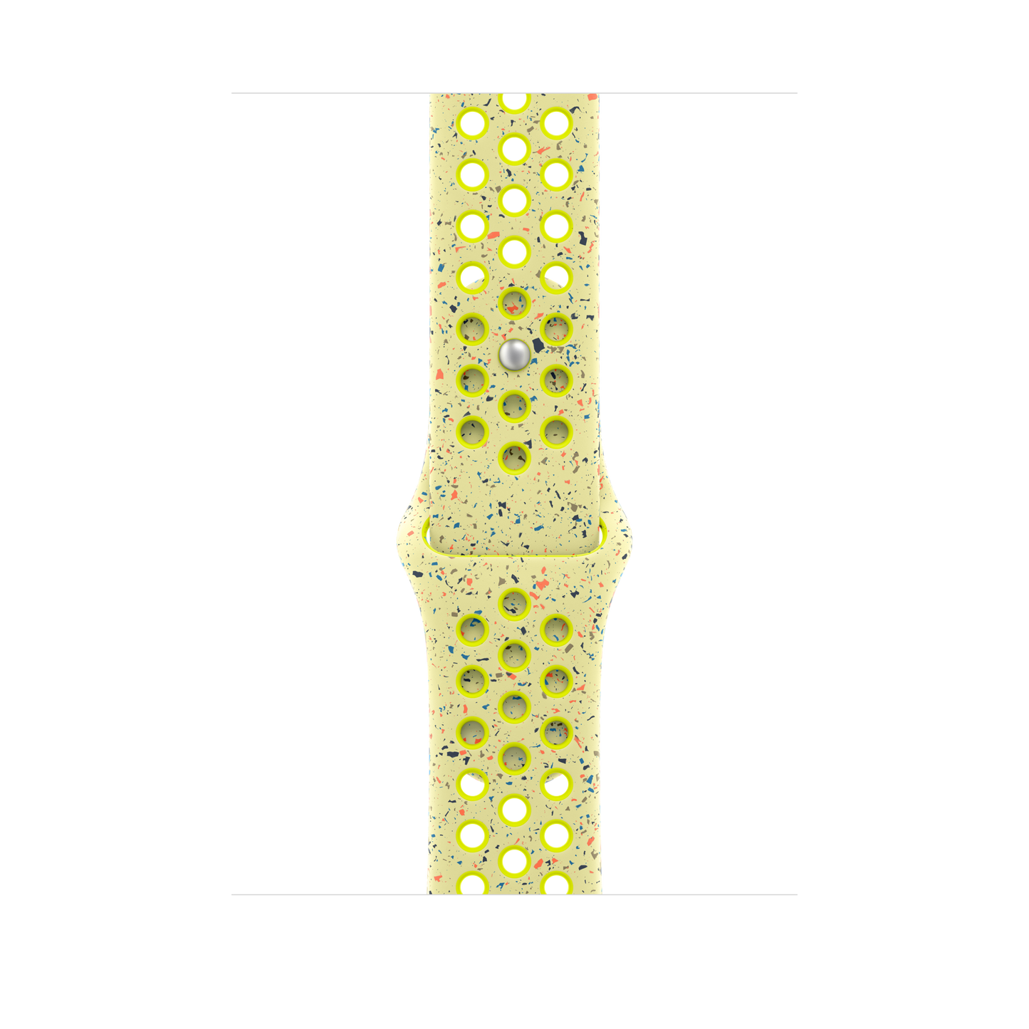 Made with compression-moulded perforations for breathability, the Nike Sport Band is durable and strong, yet surprisingly soft. It features colourful flakes that create a randomised pattern, making each strap completely unique. The smooth, dense material drapes elegantly across your wrist and feels comfortable next to your skin. A new aluminium pin-and-tuck closure gives the pin a fresh matt finish. This strap contains at least 32% recycled fluoroelastomer, with each flake containing at least 66% recycled fluoroelastomer.