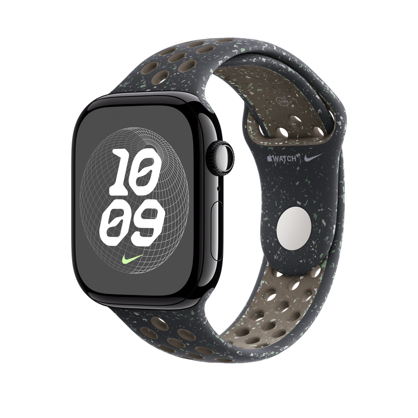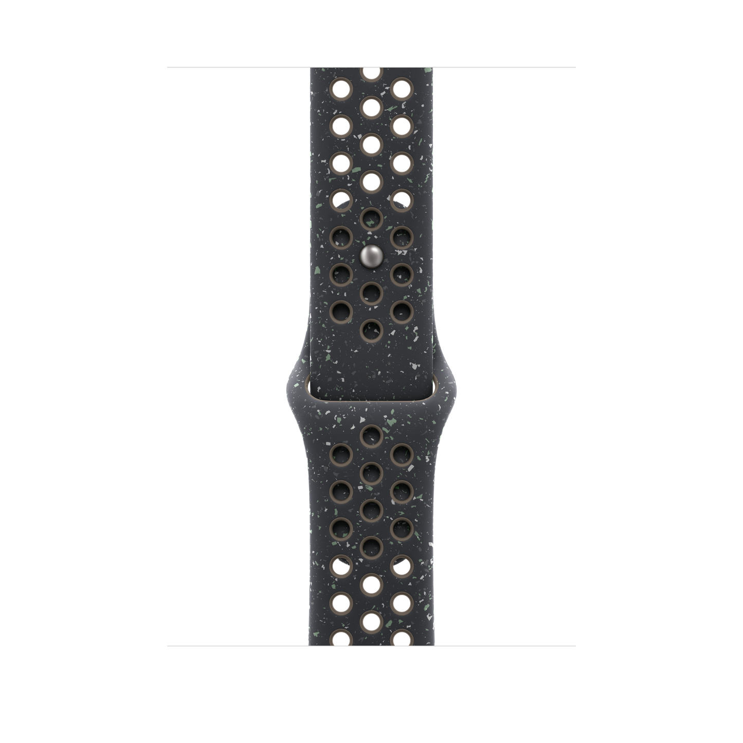 Made with compression-moulded perforations for breathability, the Nike Sport Band is durable and strong, yet surprisingly soft. It features colourful flakes that create a randomised pattern, making each strap completely unique. The smooth, dense material drapes elegantly across your wrist and feels comfortable next to your skin. A new aluminium pin-and-tuck closure gives the pin a fresh matt finish. This strap contains at least 32% recycled fluoroelastomer, with each flake containing at least 66% recycled fluoroelastomer.