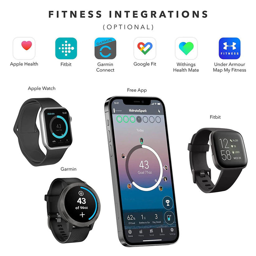 Water Tracking Through Tapping - The free HidrateSpark App recommends a daily personalized hydration goal & tracks a full bottle when you tap your phone to the Tap to Track smart tag to show your progress, available on Android and iOS. NFC Smart Tag syncs to the HidrateSpark App and records your hydration after drinking a full bottle of water. Glows remind you to drink 12 times throughout the day and can be customized by color. Button interface to turn reminder glows on, change color, and snooze the next reminder glow. Made with BPA-free light-weight, shatter and odor resistant Tritan plastic.