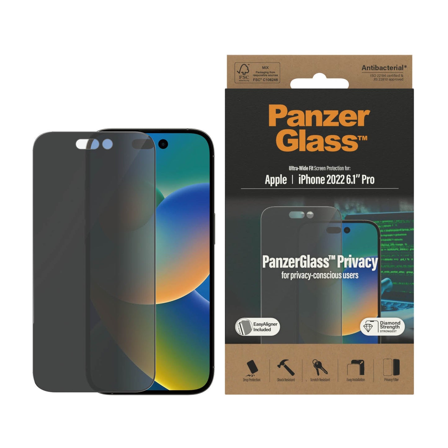 Diamond Strength,Especially designed privacy filter Antibacterial, Proven to kills up to 99.99% of all common suface bacteria, Covers the entire front surface of the phone, Can be re-installed up to 200 times, With EasyAligner that makes installation so simple, FSC-certified packaging