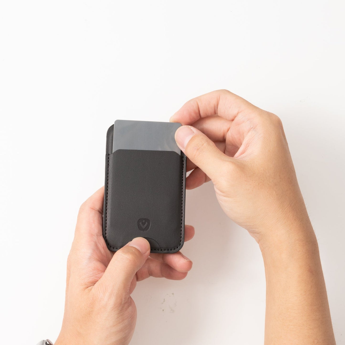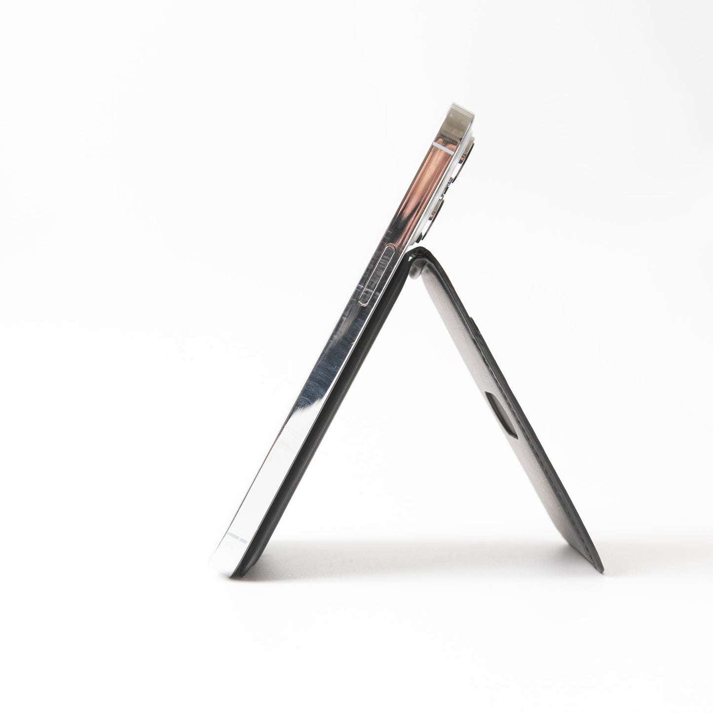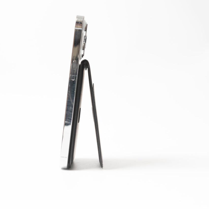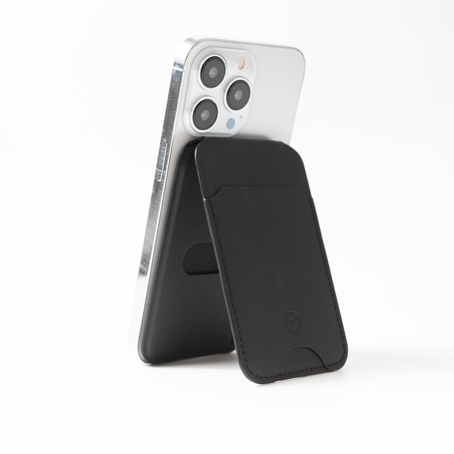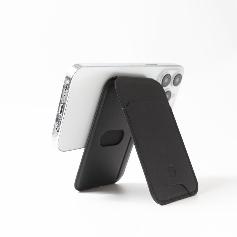 Attach the black Valenta MagSafe Card Holder with Stand with an iPhone that supports MagSafe. This card holder and stand in one from Valenta is very functional and stylish.